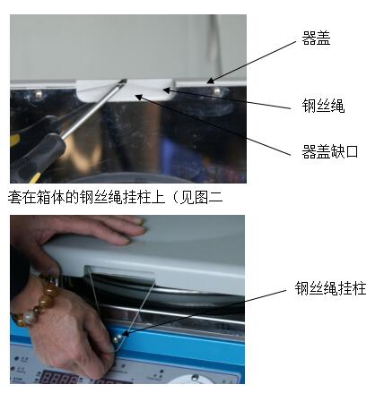到達(dá)開蓋的溫度后,用左手扶壓住機蓋,右手手指拉出器蓋正前方缺口內(nèi)的鋼絲繩。(見圖一)