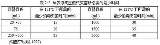 滅菌器內(nèi)冷空氣,以便使蒸汽能到達各個消毒部位,保證消毒滅菌徹底。然后繼續(xù)加壓加熱,當壓力表讀數(shù)達到1.0~1.1 kg/cm2為121 ºC,保持15~20 min即可。由于消毒滅菌效果取決于溫度而不是壓力,所以在一定壓力下保持較長的消毒滅菌時間是必須的。在121 ºC的蒸汽溫度下可以很快殺死各種細菌及高度耐熱的芽孢桿菌,因此許多培養(yǎng)液的消毒滅菌壓力、溫度一般保持在1.0~1.1 kg/cm2、121 ºC。消毒滅菌時間與需要消毒滅菌的培養(yǎng)液量密切相關(表2-3),時間不足達不到滅菌效果,時間過長培養(yǎng)液內(nèi)的一些化學物質(zhì)遭到破壞,影響培養(yǎng)液成分。消毒滅菌結(jié)束后,關閉熱源,只有當