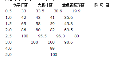 (三)紫外線滅菌法:波長200~300nm,易穿透潔凈的水和空氣,用于空氣和物體表面滅菌。紫外線燈有效使用期一般為3000小時(shí)。 紫外線照射時(shí)間對微生物殺滅率見表: 照射時(shí)間(小時(shí)) 殺 滅 率 (%)