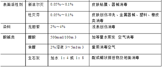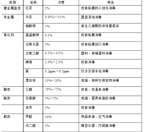 具有殺死微生物的化學(xué)藥物稱消毒劑。消毒劑對人體有毒性作用,只能外用,不能內(nèi)服。主要用于皮膚粘膜的傷口、器械、排泄物和周圍環(huán)境的消毒。消毒劑在低濃度時也可作防腐用,但防腐劑的關(guān)鍵是應(yīng)要對人體無毒性作用。消毒劑種類濃度與用途見表 13-1。 常用消毒劑的種類濃度與用途
