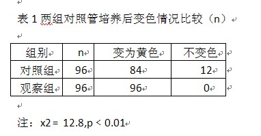 2.1兩組對(duì)照管經(jīng)培養(yǎng)后變色情況比較見(jiàn)表1